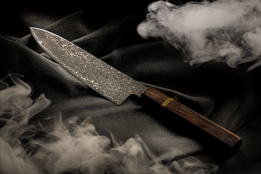 Katana Saya Smoke draws inspiration from long established traditions associated with Japanese blacksmiths to introduce this new collection. The luxurious black colour is created by an acid wash applied to the steel following the forging process. In addition to the beautiful black colour, this process adds to the rigidity of the steel and increases its corrosion resistance. The Black Damascus steel retains the superior quality expected from Katana Saya. The 67 Layers of VG-10 steel maintain a Rockwell Hardness Rating of HRC 60+2, a match for any premium kitchen knife. The mesmeric blade would not be complete without a handle of equal luxury. The dark Ebony wood is befitting of this knife’s quality. This hardwood, with a copper ferrule, not only looks striking, but feels robust and well balanced in the hand.