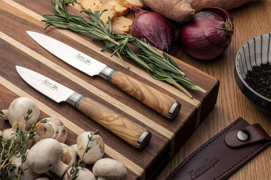 Classic chestnut shaped handles provide a natural, comfortable grip for easy control. Crafted with unique Olive Wood and a decorative opal effect ring, these beautiful knives won't fail to delight.