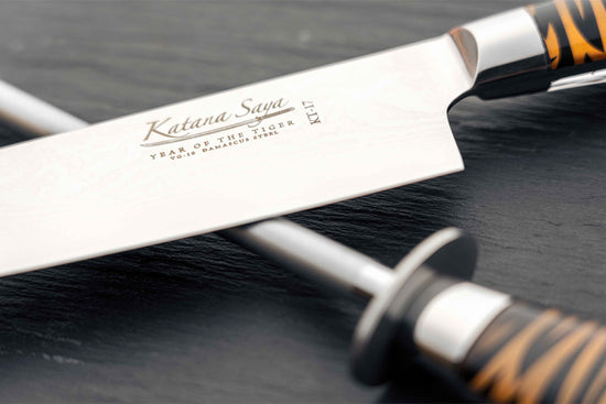 The Katana Saya Tiger range combines the cutting performance of Japanese VG-10 Damascus Steel blades with a striking tiger print design. Developed in The Year of the Tiger, this eye-catching collection of knives will bring a touch of the wild into your kitchen. Well-balanced and comfortable to hold, these tiger print handle kitchen knives provide a fearsome armoury of kitchenware. Each knife comes presented in an attractive gift box with either a wooden saya or leather sheath. Browse this fuurrrocious collection of knives today.