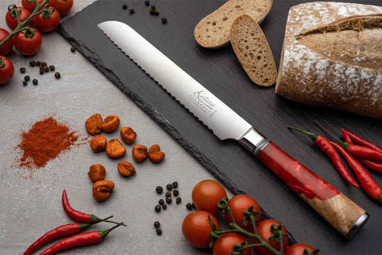 Colourful, translucent red resin fused with Olive wood create truly unique handles that represents the intense fire from natural volcanoes.