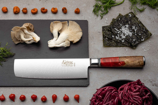 The blades from the Katana Saya Elements Volcanic 3 Piece Knife Set have 67 layers of VG-10 Damascus steel. Damascus steel blends the durability of carbon steel with the corrosion resistance of stainless steel which gives it exceptional toughness. The exquisite craftsmanship in these knives can be seen in the elegant layered pattern on the blade. The unique handle is made from olivewood and a vibrant red translucent resin.