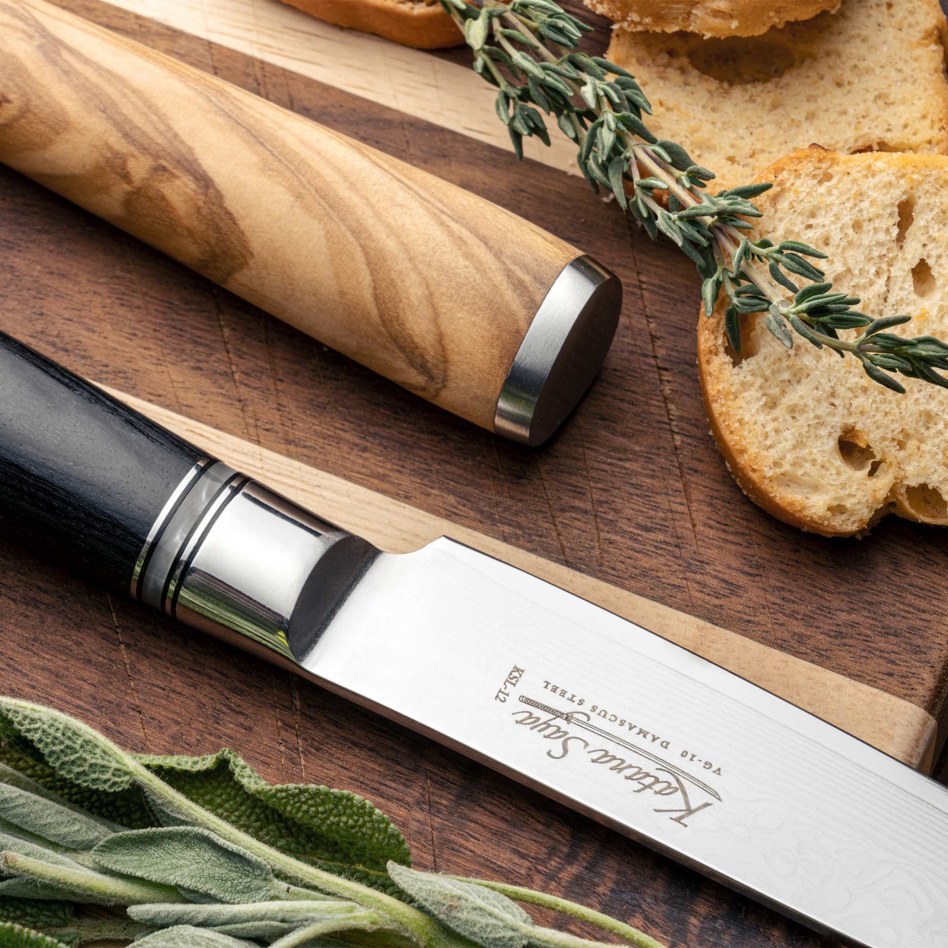 The Western Olive wood range comes gift boxed with a leather sheath that offers great protection for your knife, protecting yourself and others from its supremely sharp edge. The blade has a 67 layers of VG-10 Damascus steel, the highest quality steel with a high carbon content that gives it exceptional toughness.