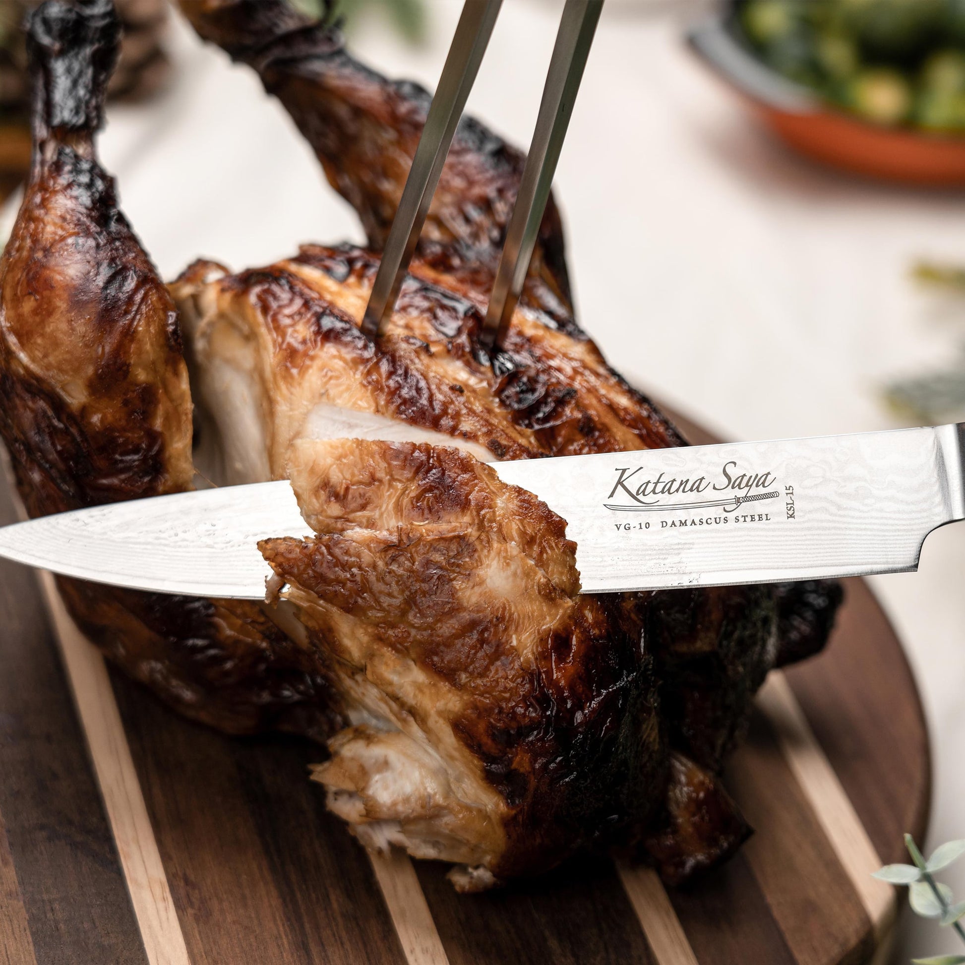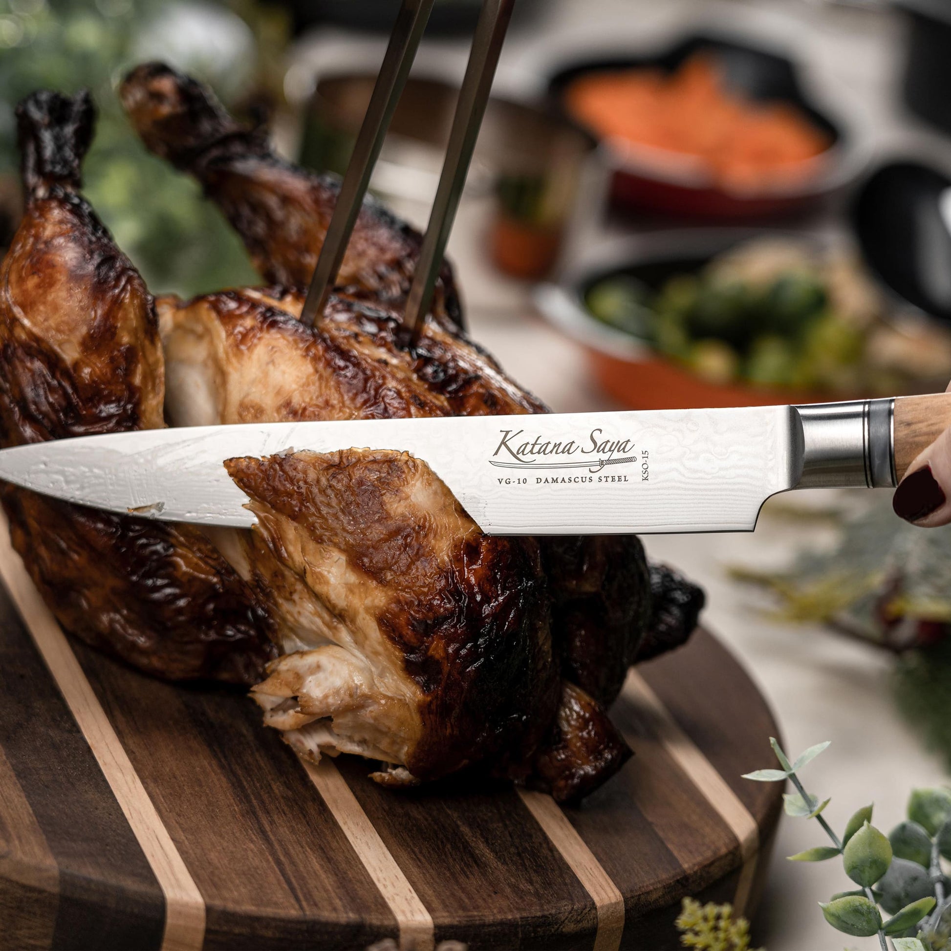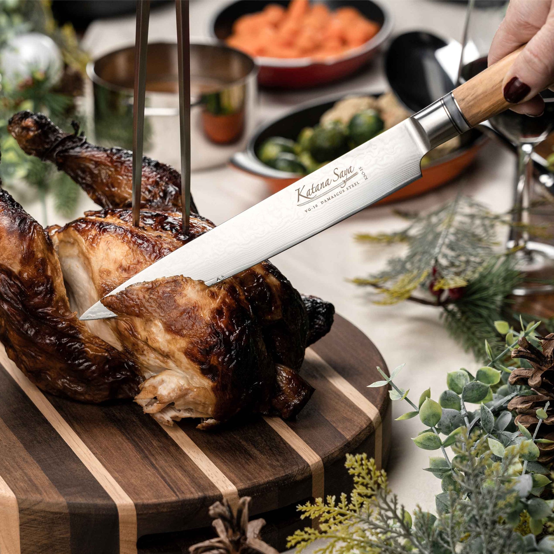 The Katana Saya Olive wood Carving fork makes the perfect pair with the carving knife and is ideal for use on all joints of meat. The two prongs feature 67 layers of VG-10 Damascus steel. The VG-10 steel is one of the most premium steels in Japanese culinary products. It is the highest quality steel with a high carbon content that gives it exceptional toughness.