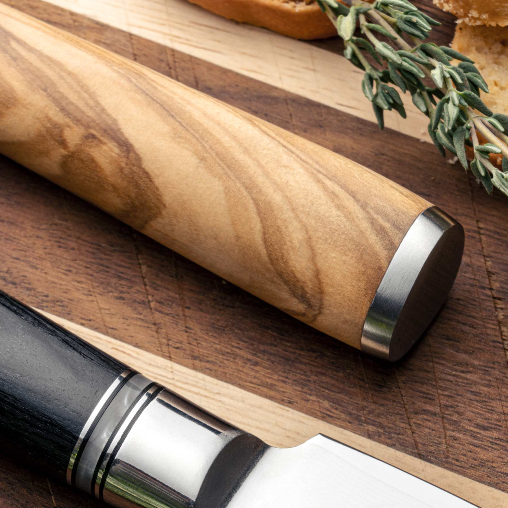 Classic chestnut shaped handles provide a natural, comfortable grip for easy control. Crafted with unique Olive Wood and a decorative opal effect ring, these beautiful knives won't fail to delight.