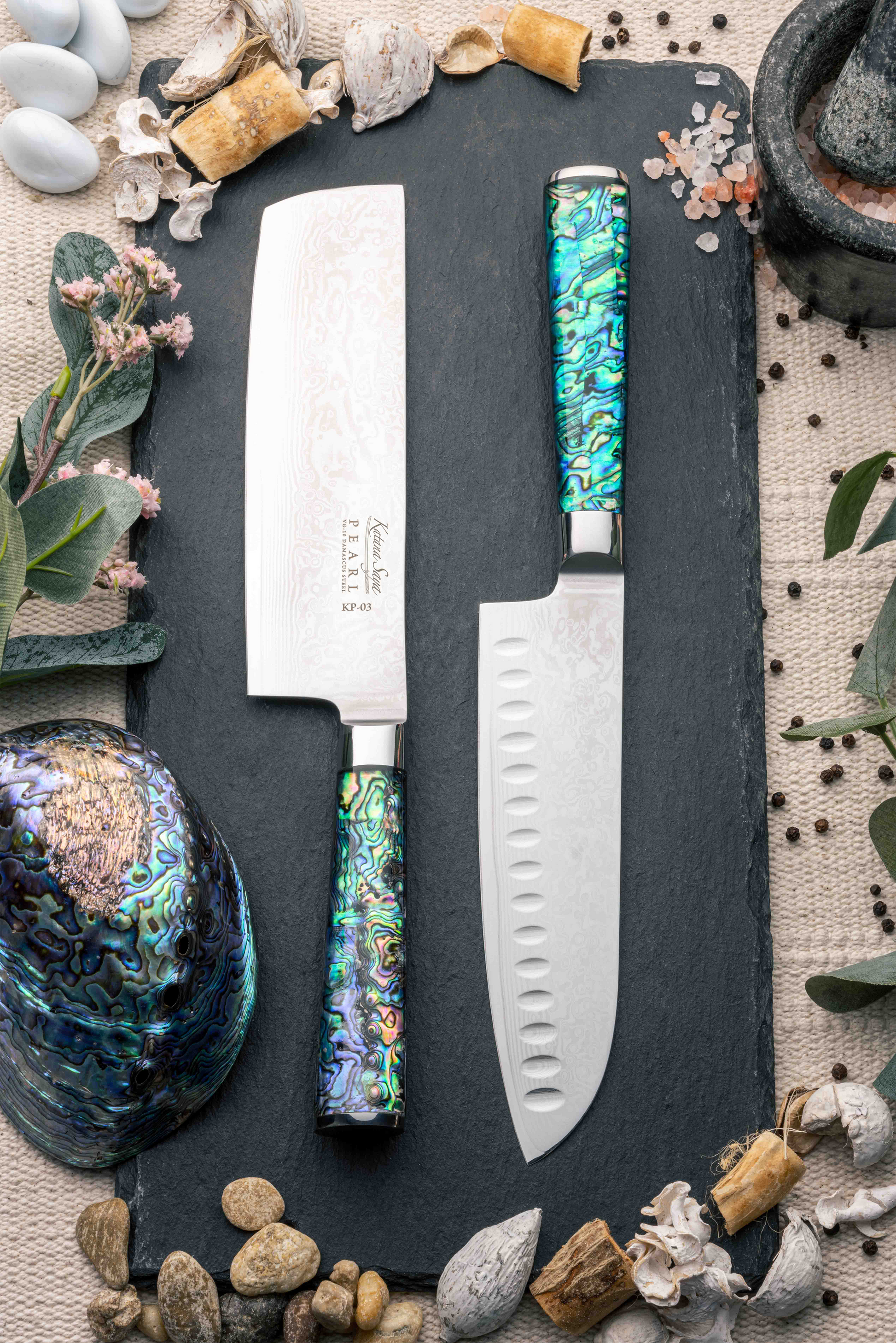 The exquisite craftmanship in these knives can be seen in the elegant layered Damascus pattern on the blade. The blade is finished with a stunning abalone shell handle which is born from beauty, striking a balance between the beauty of the ocean and hard wearing-durability.