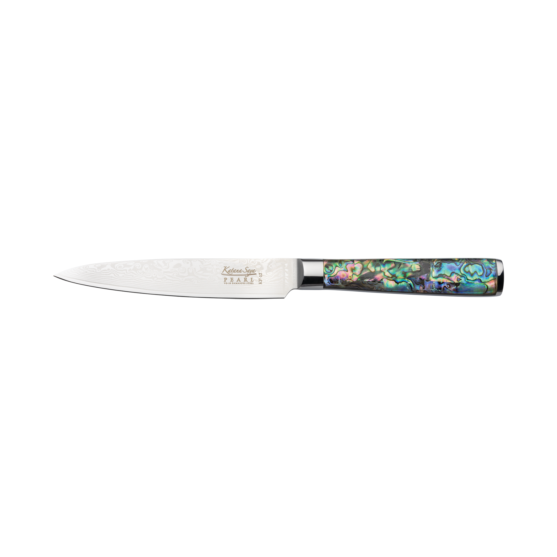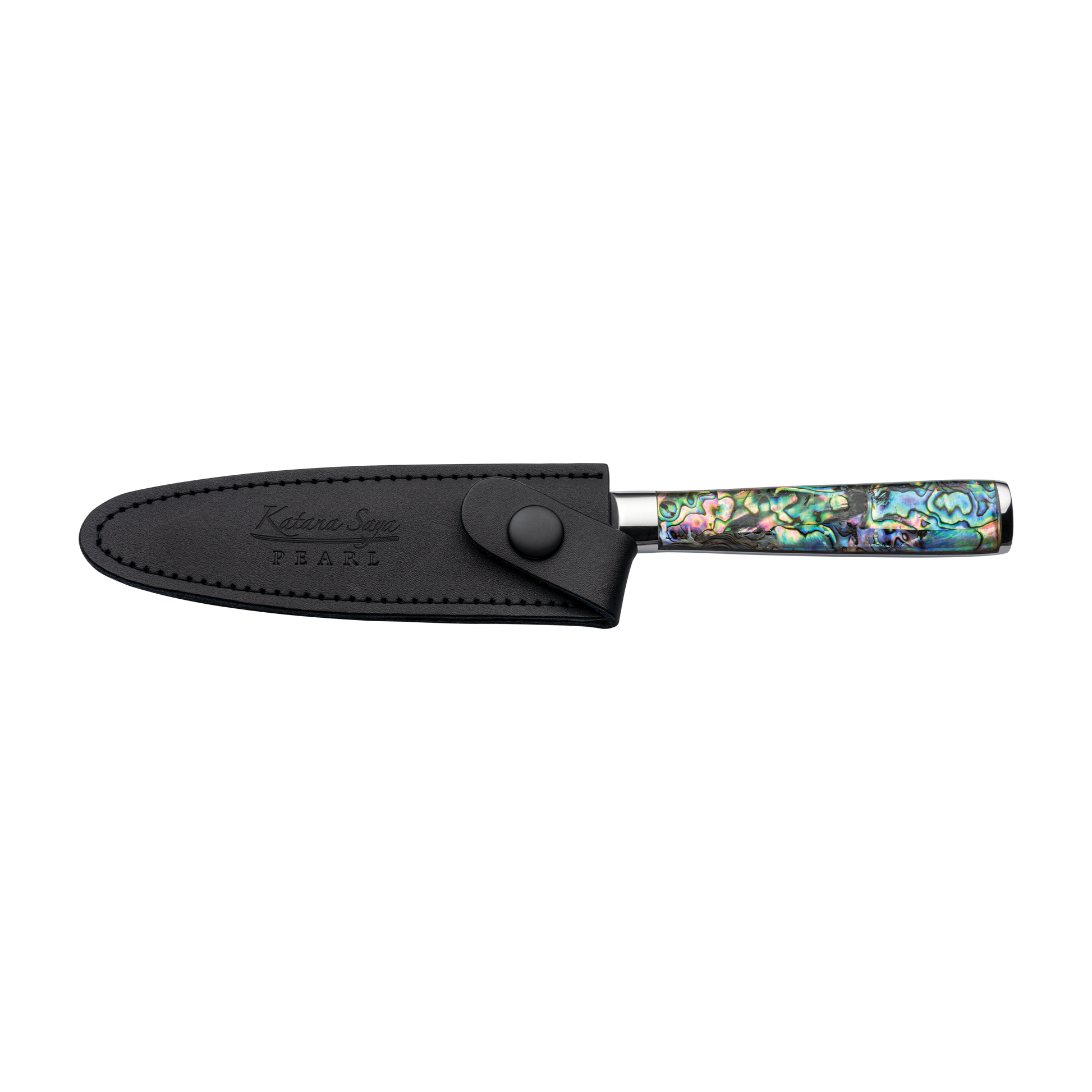 This Katana Saya Pearl 12cm Utility Knife is a small but versatile knife. The 12cm blade is not as precise as the paring but it has greater strength. The utility can be seen as a small chef’s knife for more delicate tasks as it is great for cutting fruit and small vegetables. The Western range comes gift boxed with a leather sheath that offers the perfect protection for your knife, protecting yourself and others from its incredibly sharp edge.