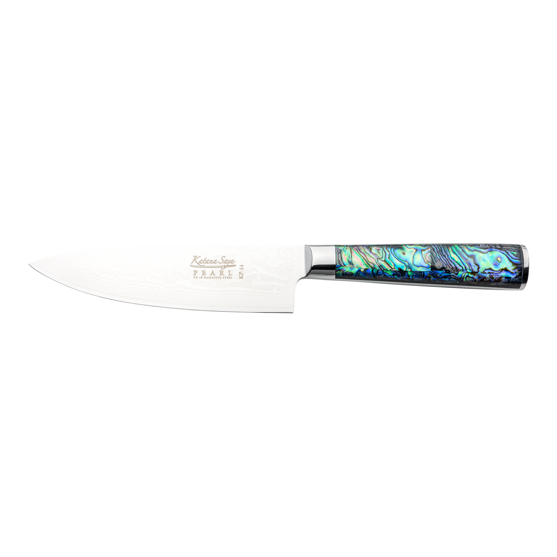 The Katana Saya Pearl 15cm Chef's Knife is the classic all-rounder. It can be used for almost any task in the kitchen. Great for chopping and slicing vegetables with speed, but just as comfortable jointing and filleting meat and fish with ease. The long, sharp blade with a pointed tip is one of the most popular across the world - A must-have for the Chef or home cook! This version of the Chef's Knife is 15cm making it perfect for smaller hands.