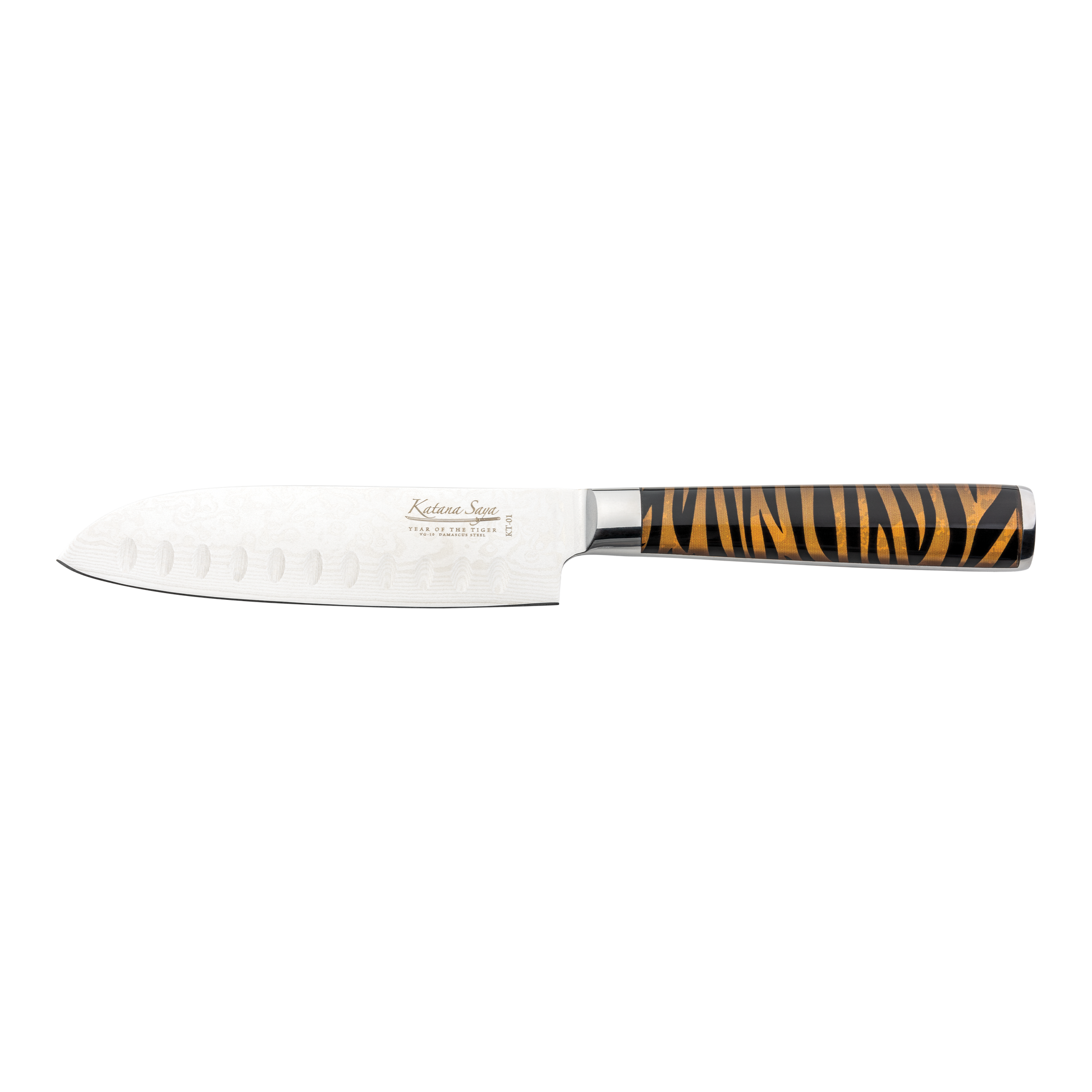 Santoku is Japanese for ‘3 Ways’ and this refers to the all-round suitability of this Katana Saya Tiger 12cm Santoku Knife to slice, dice and prepare food as required. A great all-round kitchen knife with a fluted blade to relieve sticking. This version is the smaller Santoku with a 12cm blade.