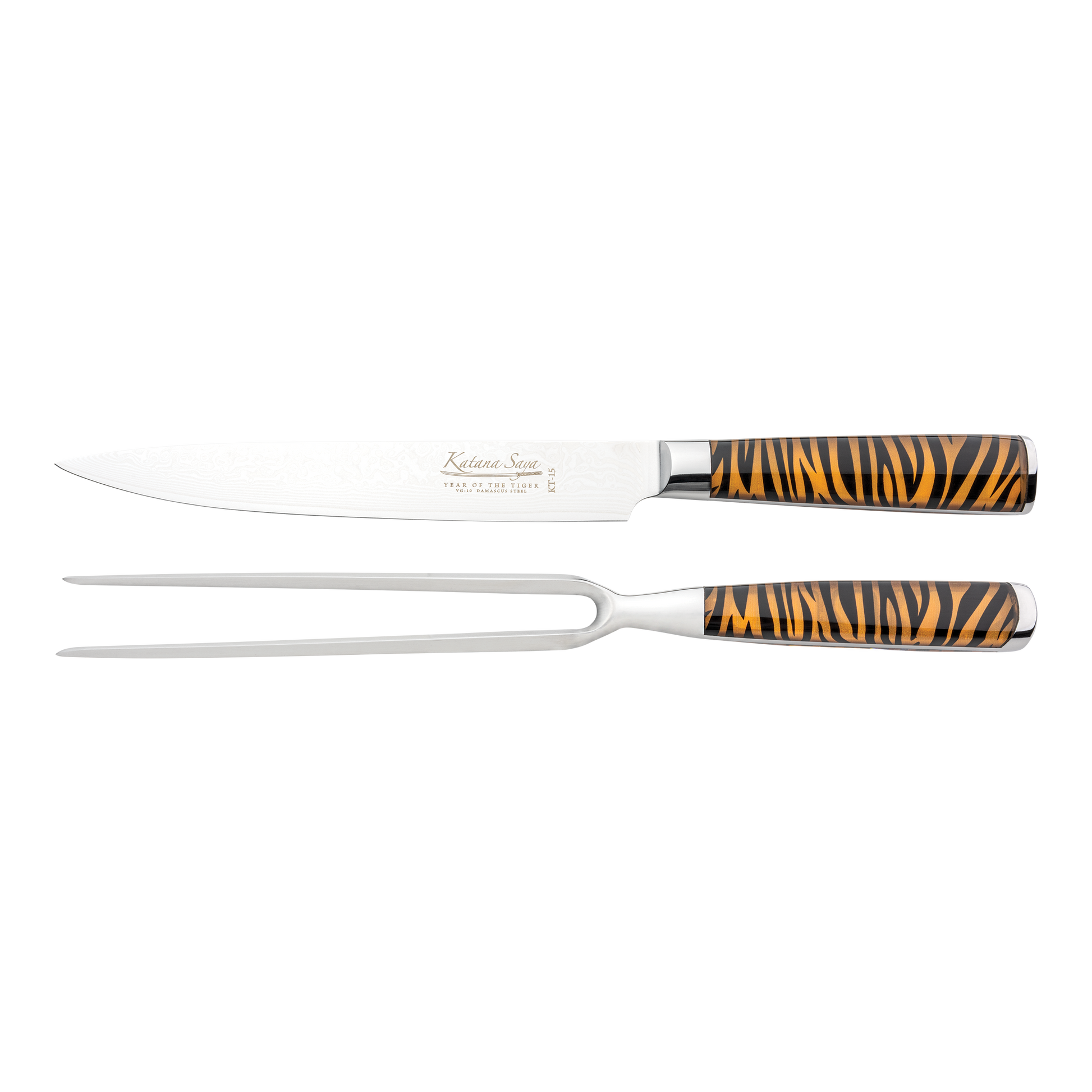 This Katana Saya Tiger 2pce Carving Set is the perfect addition to your Sunday lunch! The carving knife blade has 67 layers of VG-10 Damascus steel, the highest quality steel with a high carbon content that gives it exceptional toughness. VG-10 steel is one of the most premium steels in Japanese culinary products as it hard and unbreakable, reaching a Rockwell hardness rating of us to 63HRC.