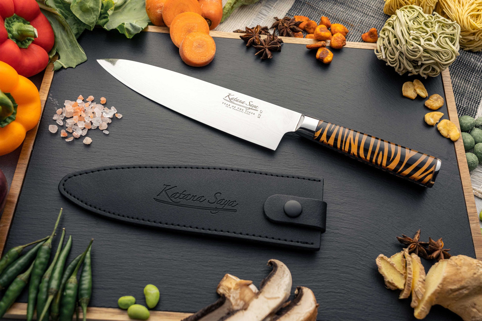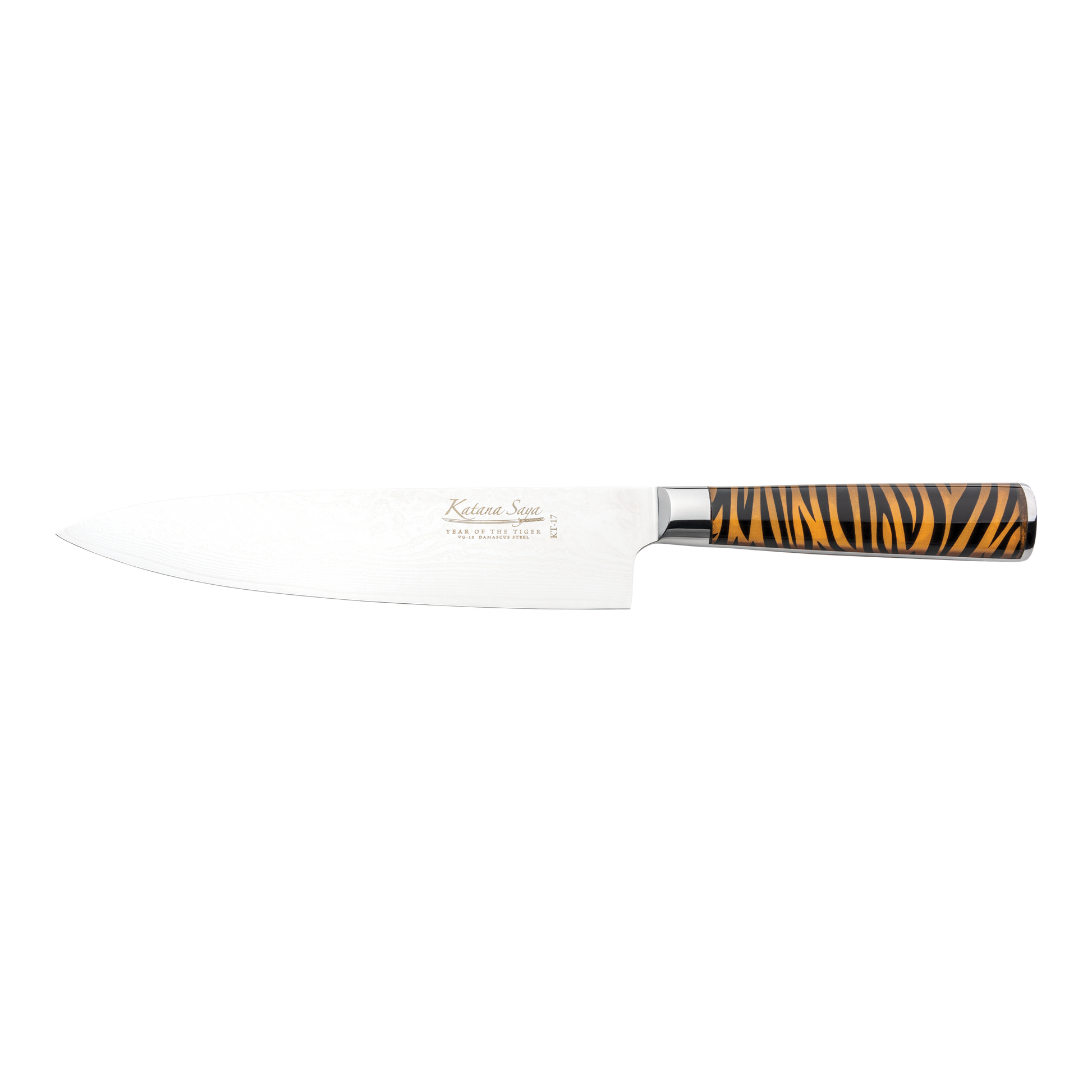 The classic all-rounder, the Chef’s Knife can be used for almost any task in the kitchen. The Katana Saya Tiger 20cm Chef's Knife is great for chopping and slicing vegetables with speed, but just as comfortable jointing and filleting meat and fish with ease. The long, sharp blade with a pointed tip is one of the most popular across the world - A must have for a chef or home cook! This version of the Chef's Knife is 20cm making it the largest in the range.
