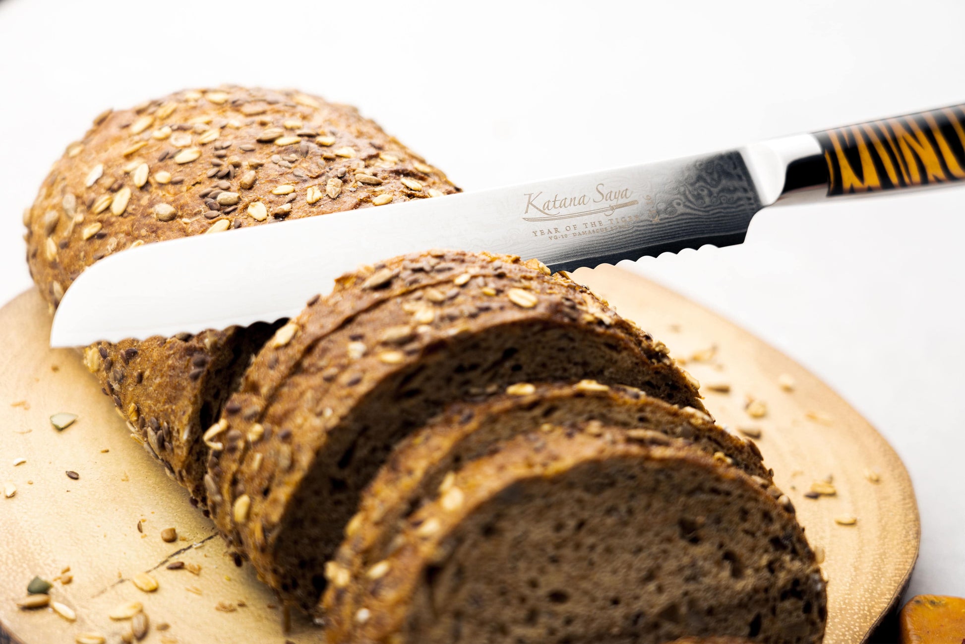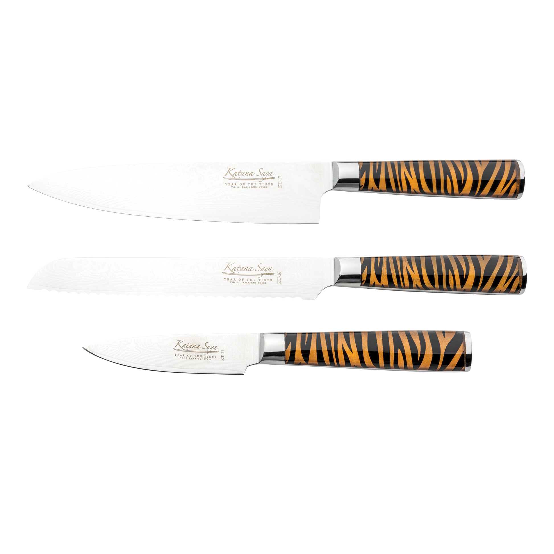 This Katana Saya Tiger 3 Pce Knife Set offers blades with 67 layers of VG-10 Damascus steel, the highest quality steel with a high carbon content that gives it exceptional toughness. VG-10 steel is one of the most premium steels in Japanese culinary products as it hard and unbreakable, reaching a Rockwell hardness rating of us to 63HRC. The incredible craftsmanship in these knives can be seen in the elegant feathered pattern on the blade. The handles feature a stunning tiger skin pattern which will look incredible in modern and traditional kitchens.