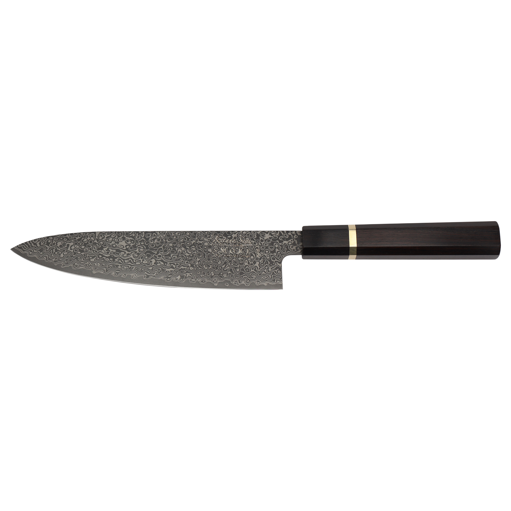 Katana Saya Smoke draws inspiration from long established traditions associated with Japanese blacksmiths to introduce this new collection. The luxurious black colour is created by an acid wash applied to the steel following the forging process. In addition to the beautiful black colour, this process adds to the rigidity of the steel and increases its corrosion resistance. The Black Damascus steel retains the superior quality expected from Katana Saya. The 67 Layers of VG-10 steel maintain a Rockwell Hardness Rating of HRC 60+2, a match for any premium kitchen knife. The mesmeric blade would not be complete without a handle of equal luxury. The dark Ebony wood is befitting of this knife’s quality. This hardwood, with a copper ferrule, not only looks striking, but feels robust and well balanced in the hand.