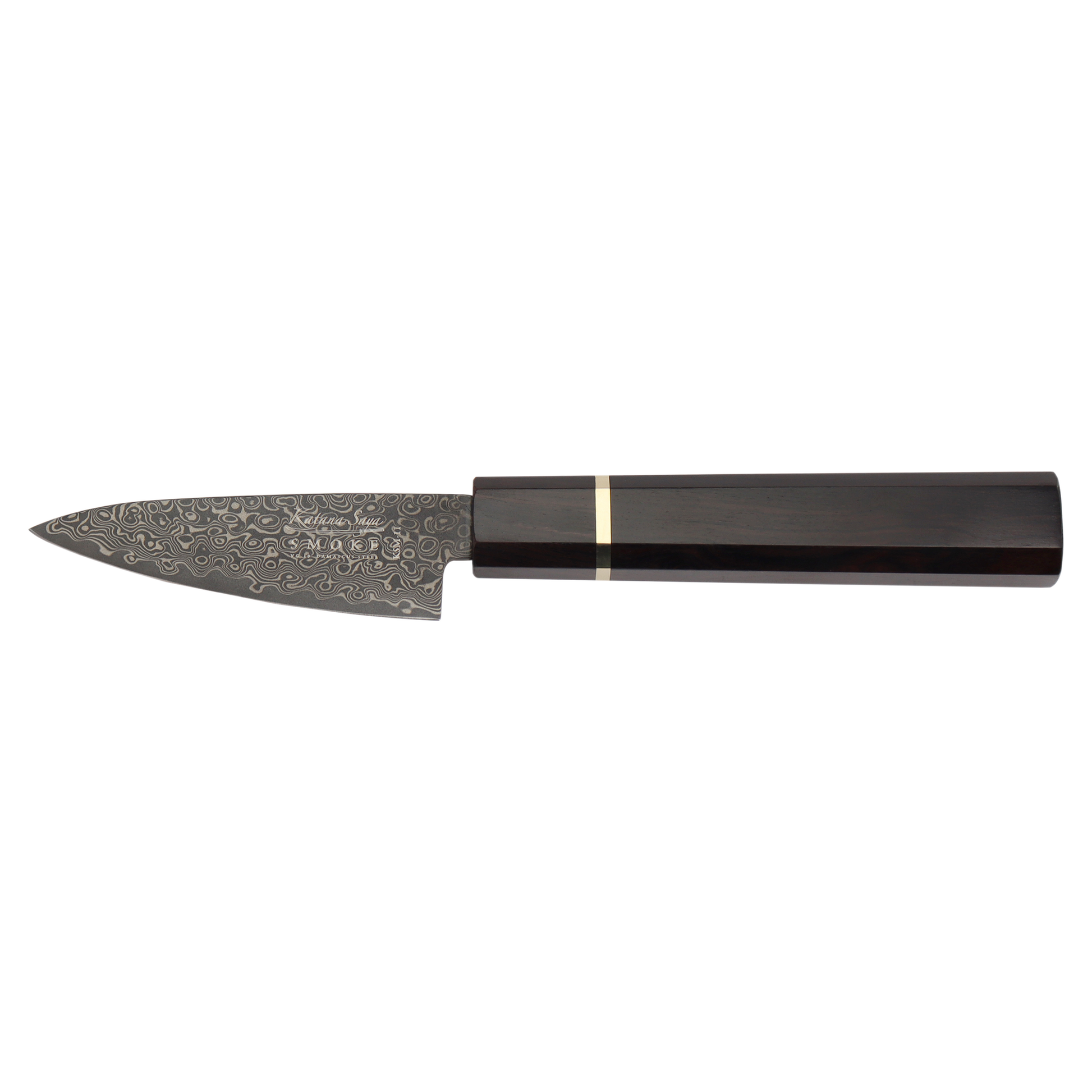 Katana Saya Smoke draws inspiration from long established traditions associated with Japanese blacksmiths to introduce this new collection. The luxurious black colour is created by an acid wash applied to the steel following the forging process. In addition to the beautiful black colour, this process adds to the rigidity of the steel and increases its corrosion resistance. The Black Damascus steel retains the superior quality expected from Katana Saya. The 67 Layers of VG-10 steel maintain a Rockwell Hardness Rating of HRC 60+2, a match for any premium kitchen knife. The mesmeric blade would not be complete without a handle of equal luxury. The dark Ebony wood is befitting of this knife’s quality. This hardwood, with a copper ferrule, not only looks striking, but feels robust and well balanced in the hand.