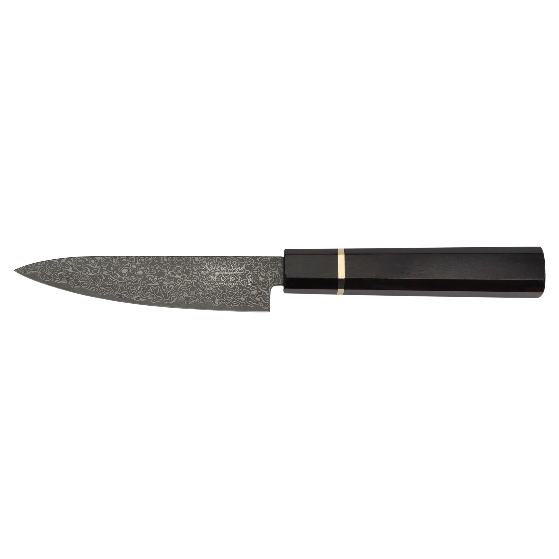 Katana Saya Smoke draws inspiration from long established traditions associated with Japanese blacksmiths to introduce this new collection. The luxurious black colour is created by an acid wash applied to the steel following the forging process. In addition to the beautiful black colour, this process adds to the rigidity of the steel and increases its corrosion resistance. The Black Damascus steel retains the superior quality expected from Katana Saya. The 67 Layers of VG-10 steel maintain a Rockwell Hardness Rating of HRC 60+2, a match for any premium kitchen knife. The mesmeric blade would not be complete without a handle of equal luxury. The dark Ebony wood is befitting of this knife’s quality. This hardwood, with a copper ferrule, not only looks striking, but feels robust and well balanced in the hand.